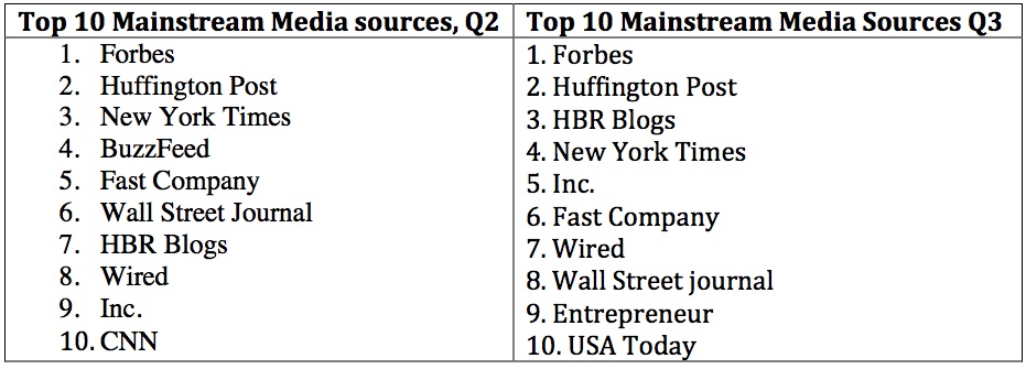 I was interested to note that Forbes continues to rank #1 and Huffington Post #2 as the courses of content most shared. Of significant interest is the increasing popularity of HBR Blogs, rising from #7 to #3 (and surpassing New York Times) in Q3. Inc has risen in popularity as well, with Wall Street Journal decreasing.